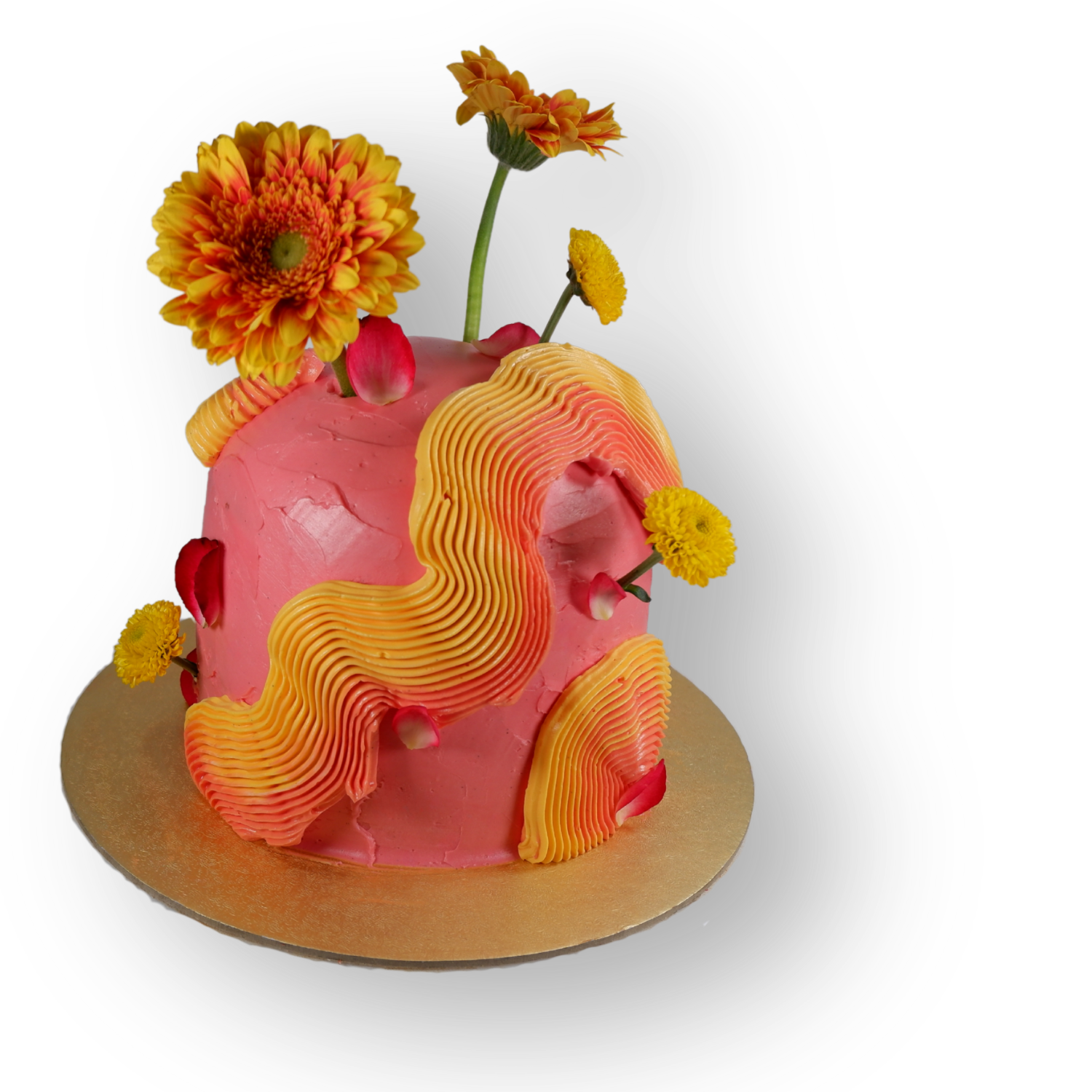 A bold dome cake inspired by golden hour skies, with wavy buttercream and seasonal florals.